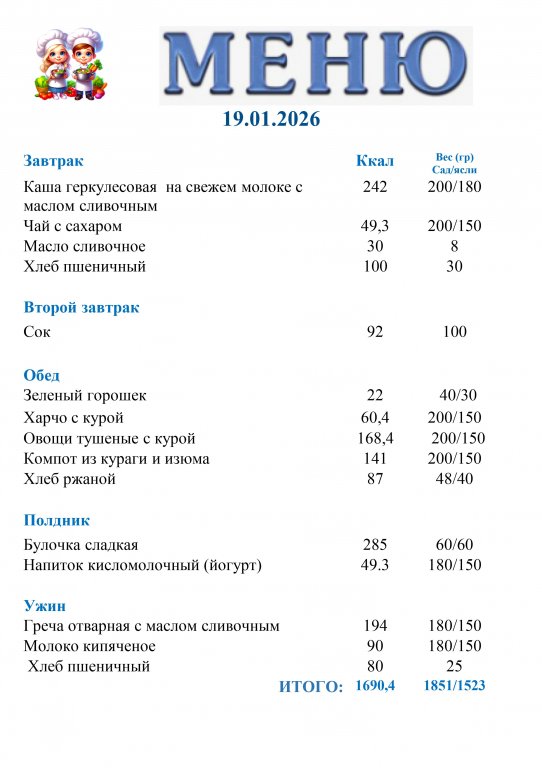 - особое внимание уделяется объему пищи, который строго соответствует возрасту ребенка, а также рациональному питанию. Меню соответствует полному, необходимому набору продуктов и соответствию соотношения белков, жиров и углеводов.