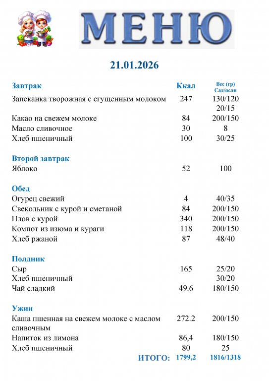 Для обеспечения преемственности питания родителей информируют об ассортименте питания ребенка, вывешивая ежедневное меню.